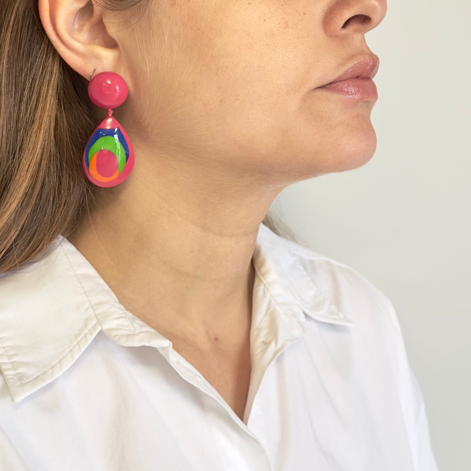 Vibrante e tropical, o Brinco Caribe combina diferentes tons de rosa com cores contrastantes para criar um mood solar e alegre.