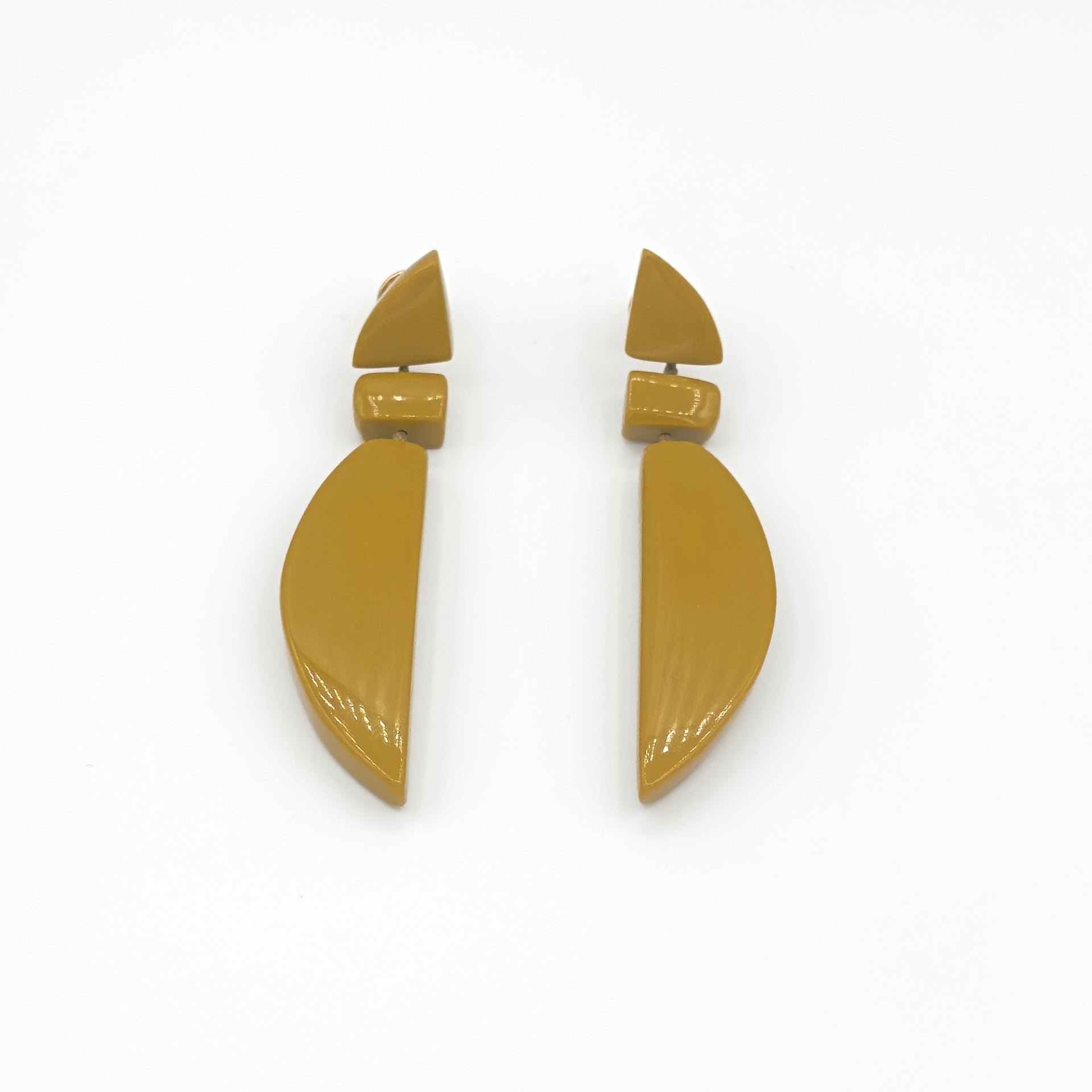 Brinco moderno em amarelo torrado, feito todo em resina, com fecho em aço inoxidável, um tom quente e tendência. Leve e cheio de estilo.