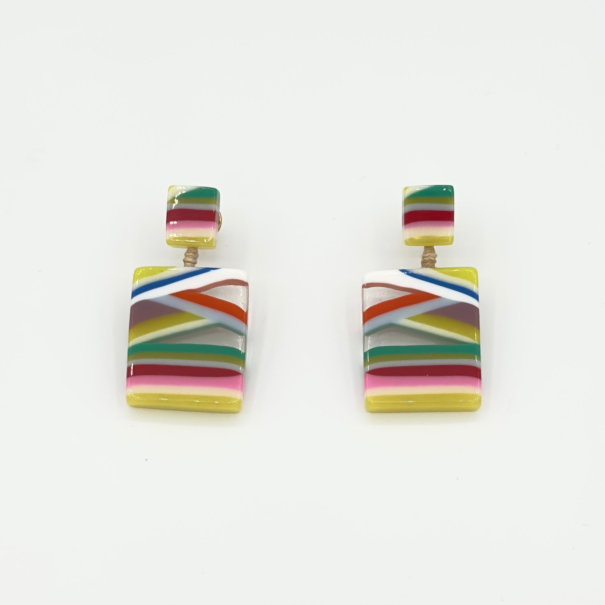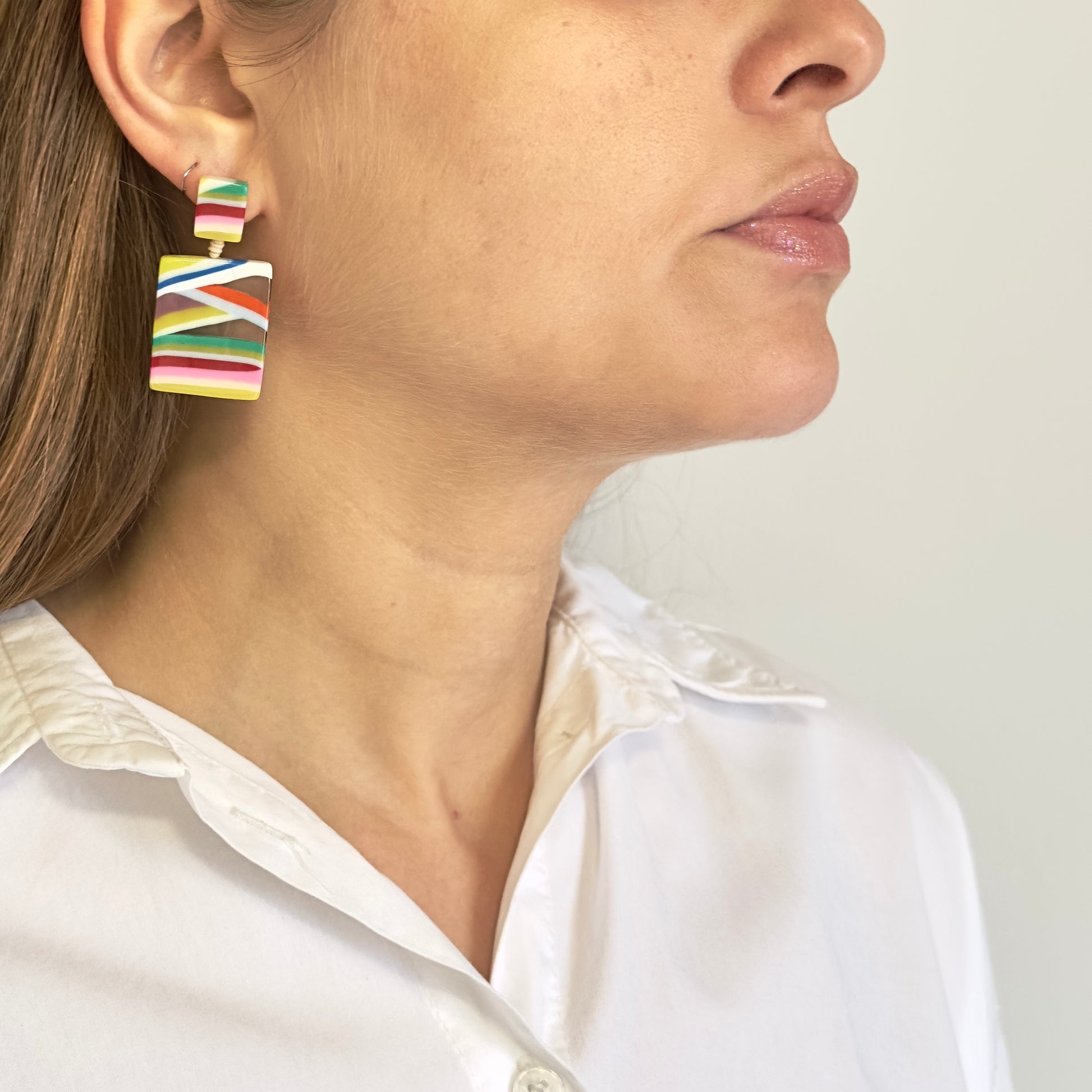 Inspirado na estética vibrante e multicultural, o Brinco Istambul une formato quadrado moderno com listras coloridas marcantes.
