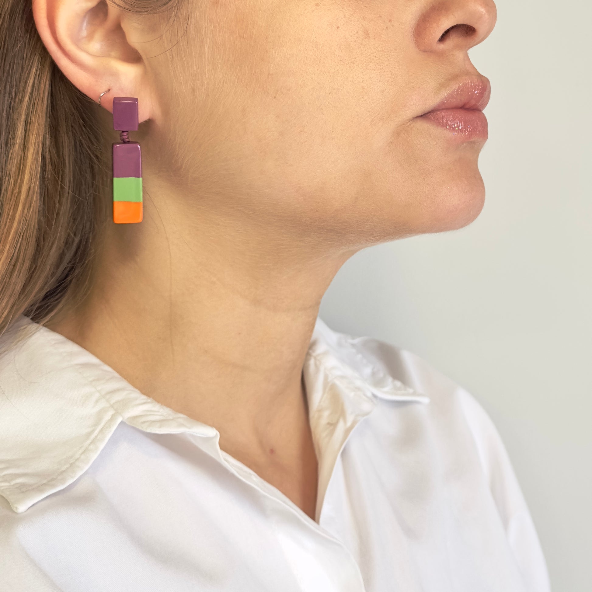 Inspirado na estética urbana moderna, o Brinco New York mistura rosa fúcsia, verde oliva e laranja em um design petit e contemporâneo.