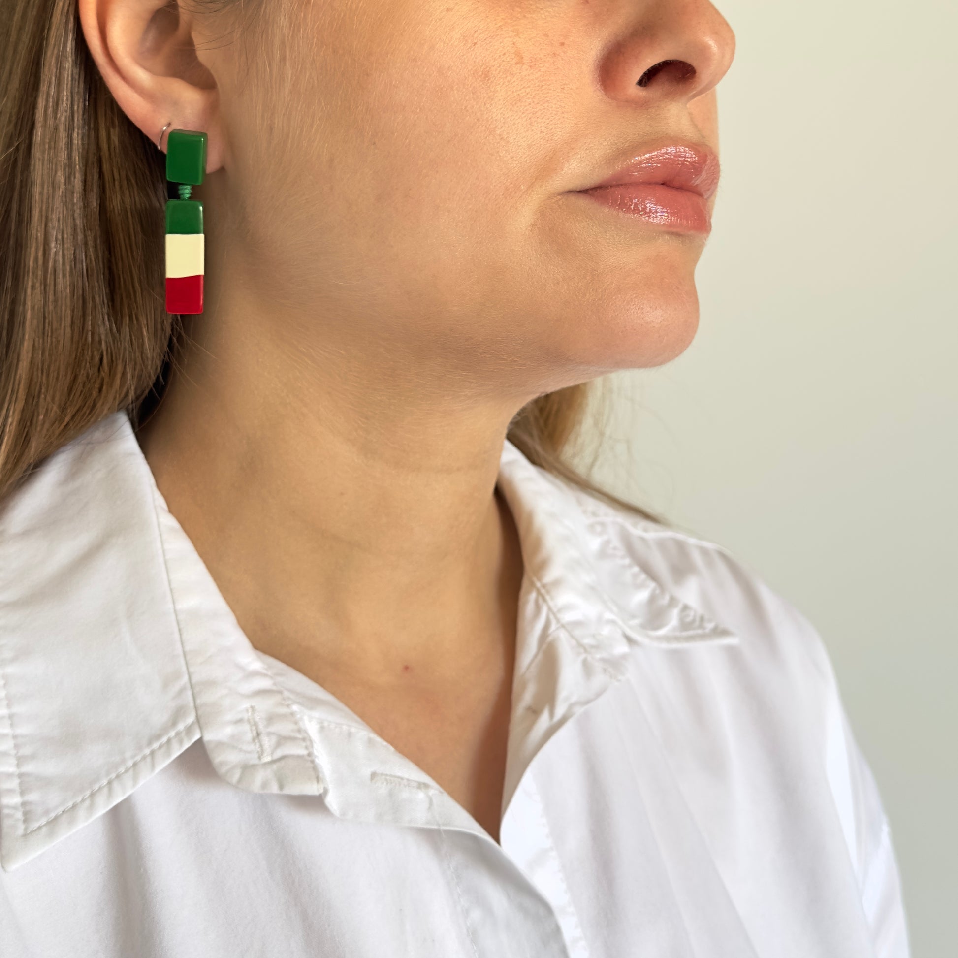 Brinco feito totalmente em resina, com design reto pequeno com combinação moderna de verde bandeira, marfim e terracota.