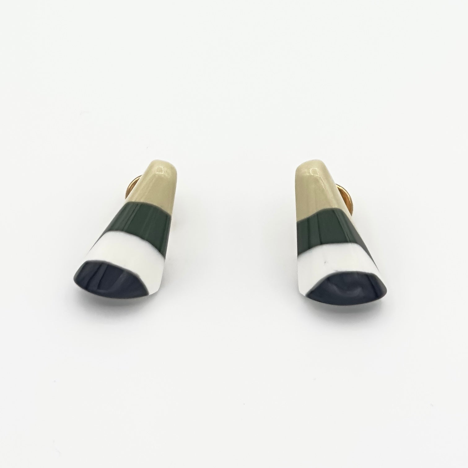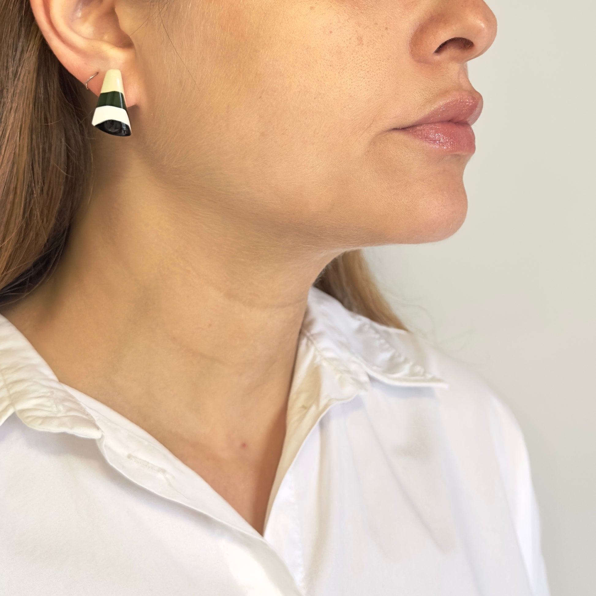 Um clássico reinventado: o Brinco Pino com Listras combina design vertical com cores vibrantes e acabamento polido. Seu formato valoriza o rosto e adiciona um toque artístico ao visual.