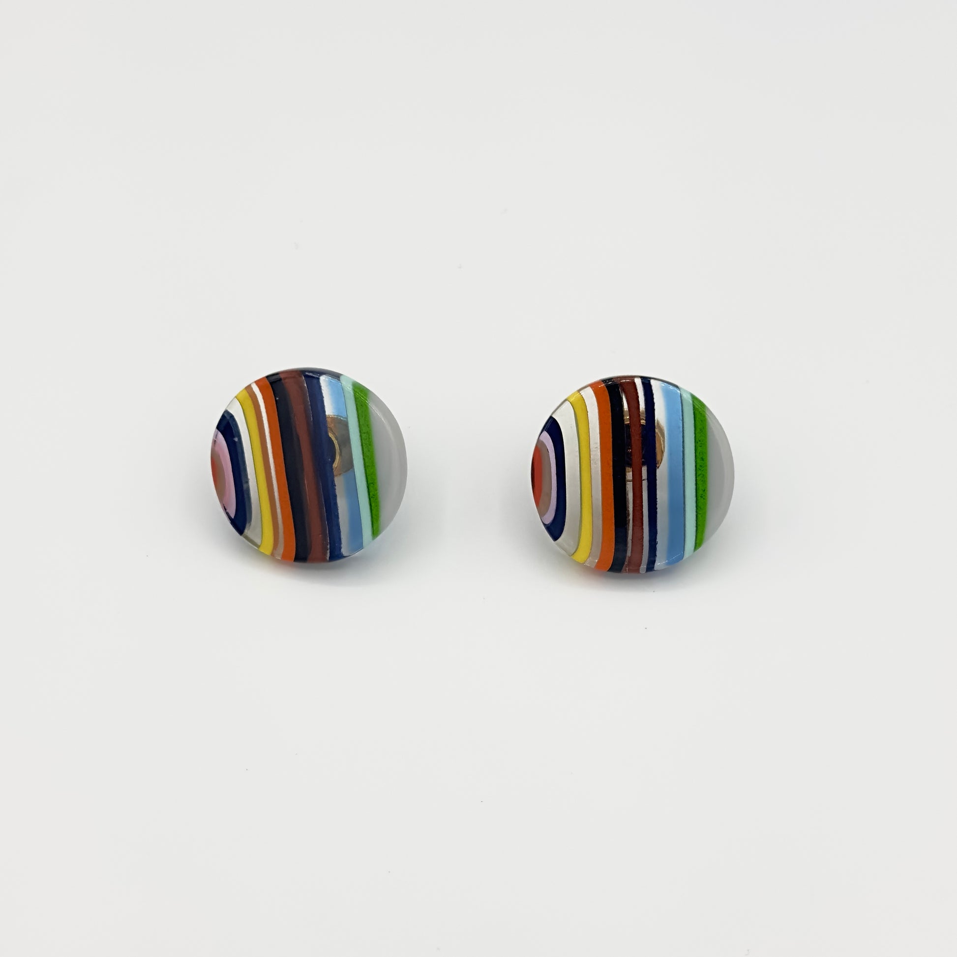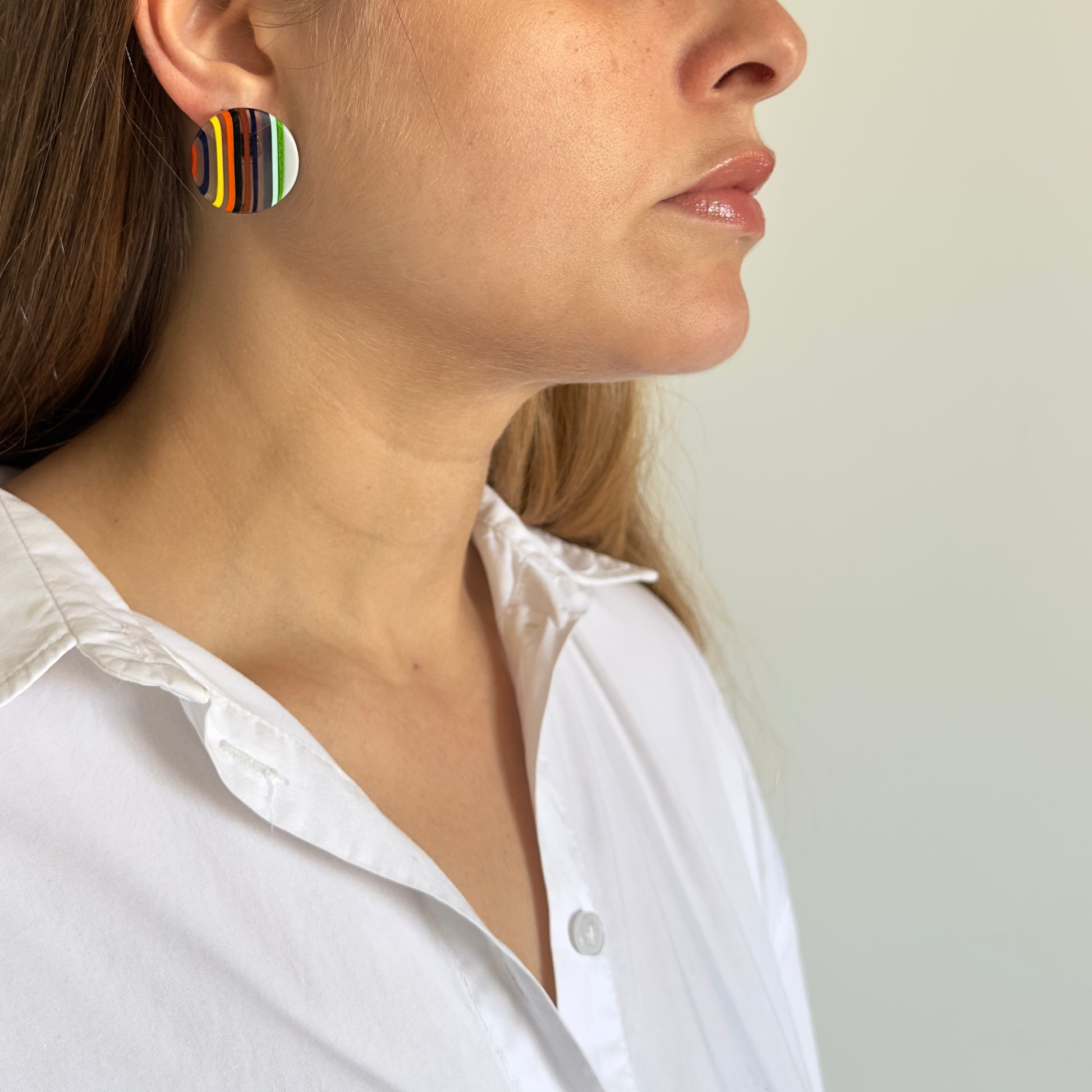 Brinco feito totalmente em resina, modelo redondo com listras vibrantes. Charmoso, moderno e superleve.