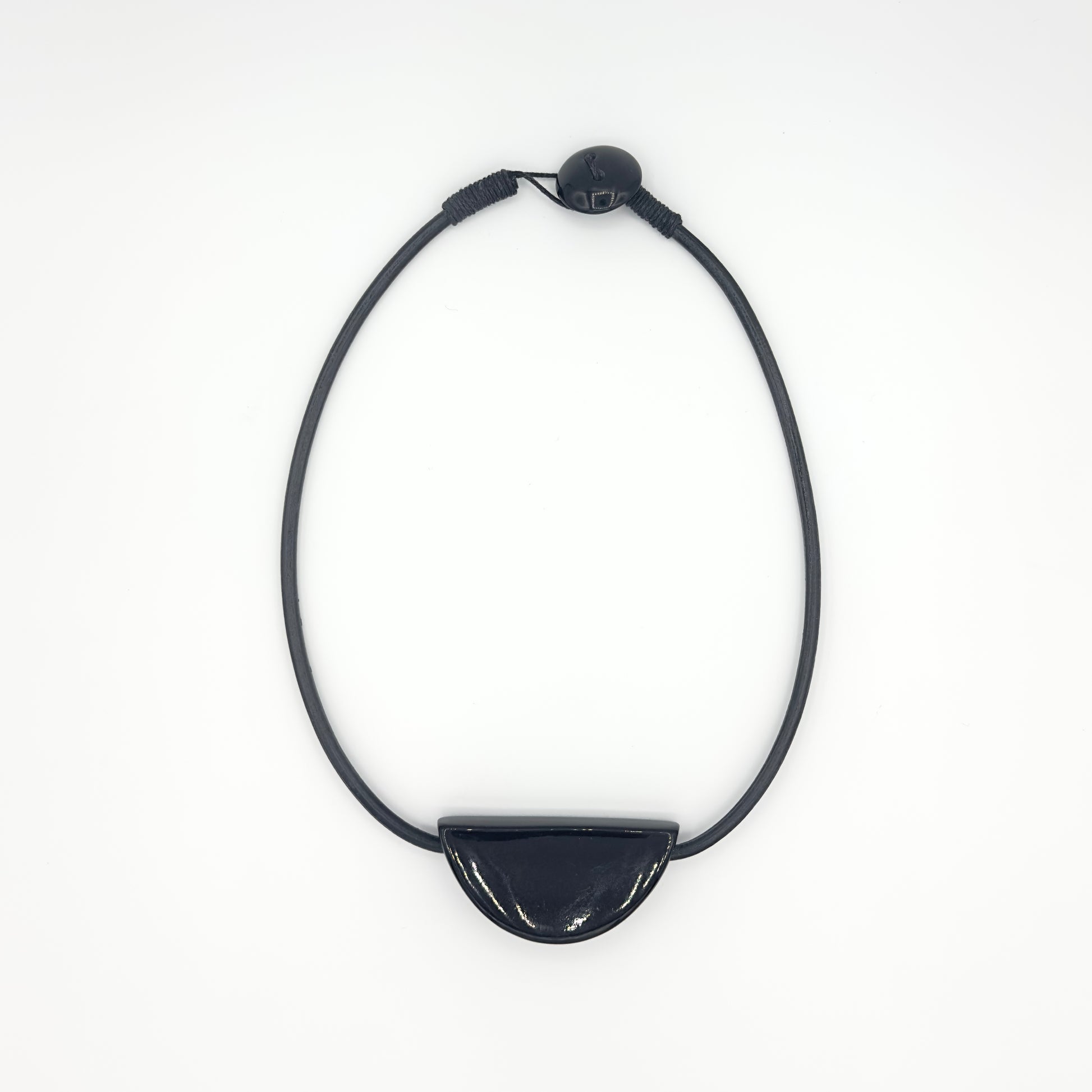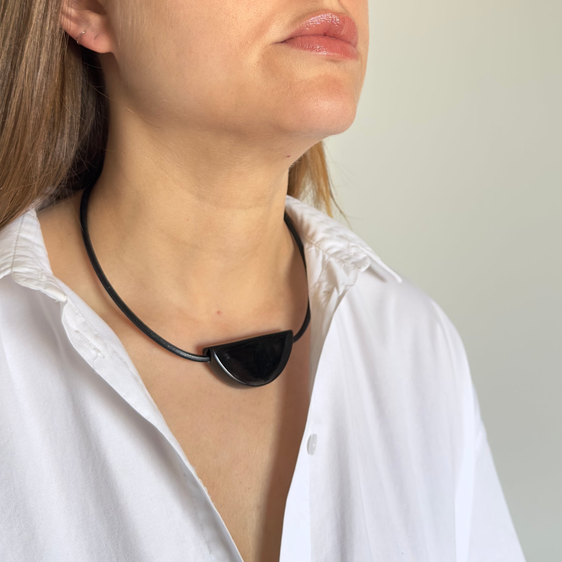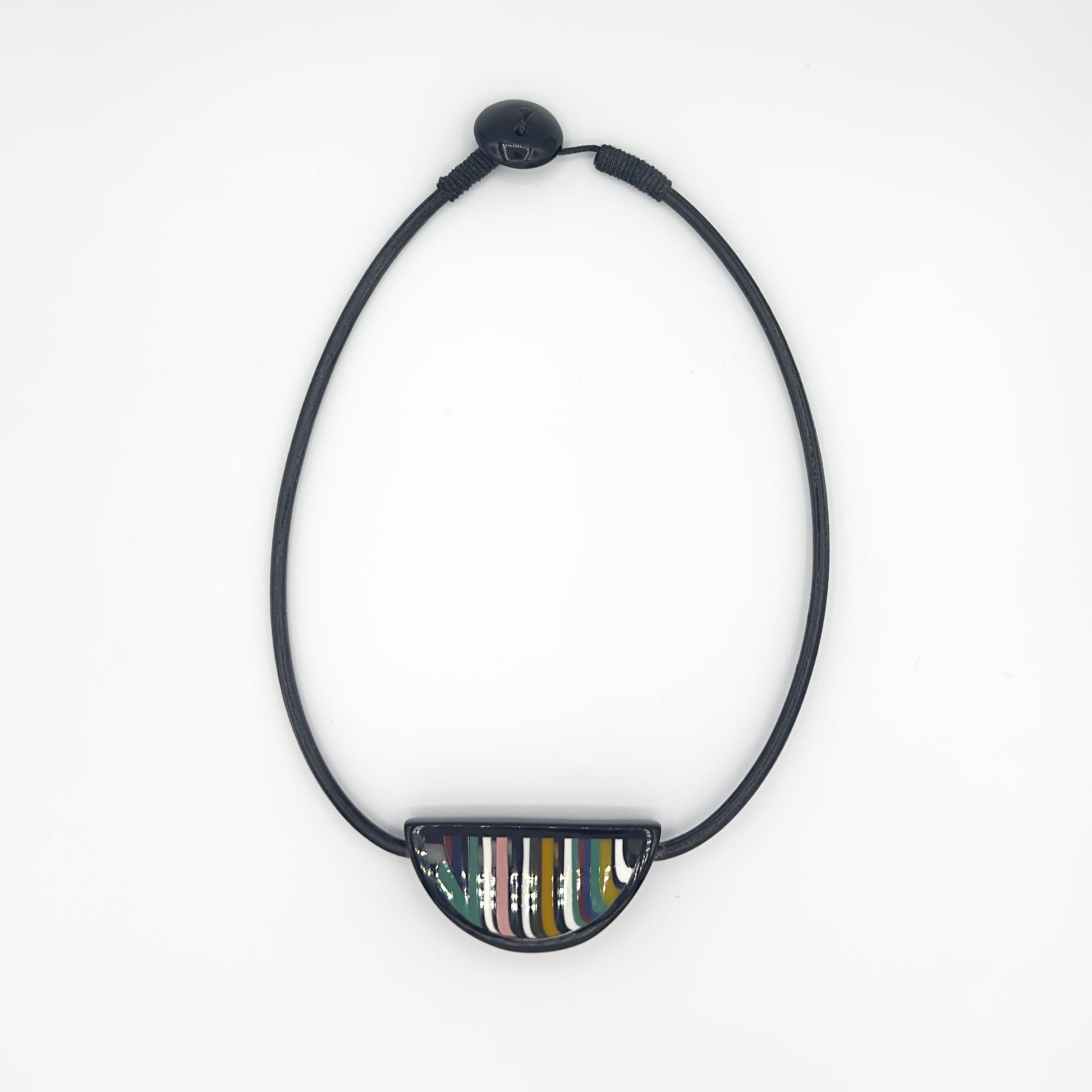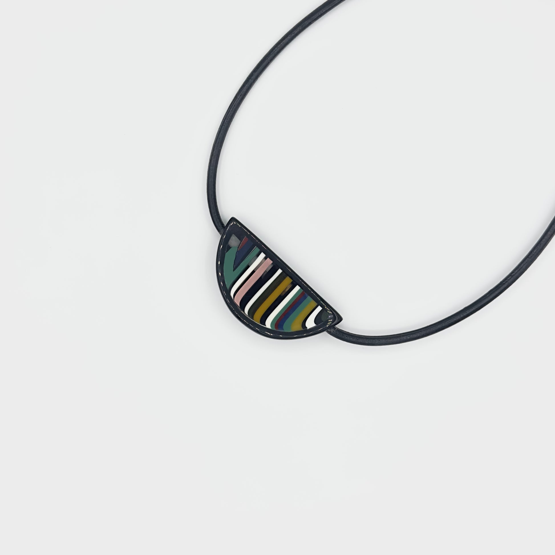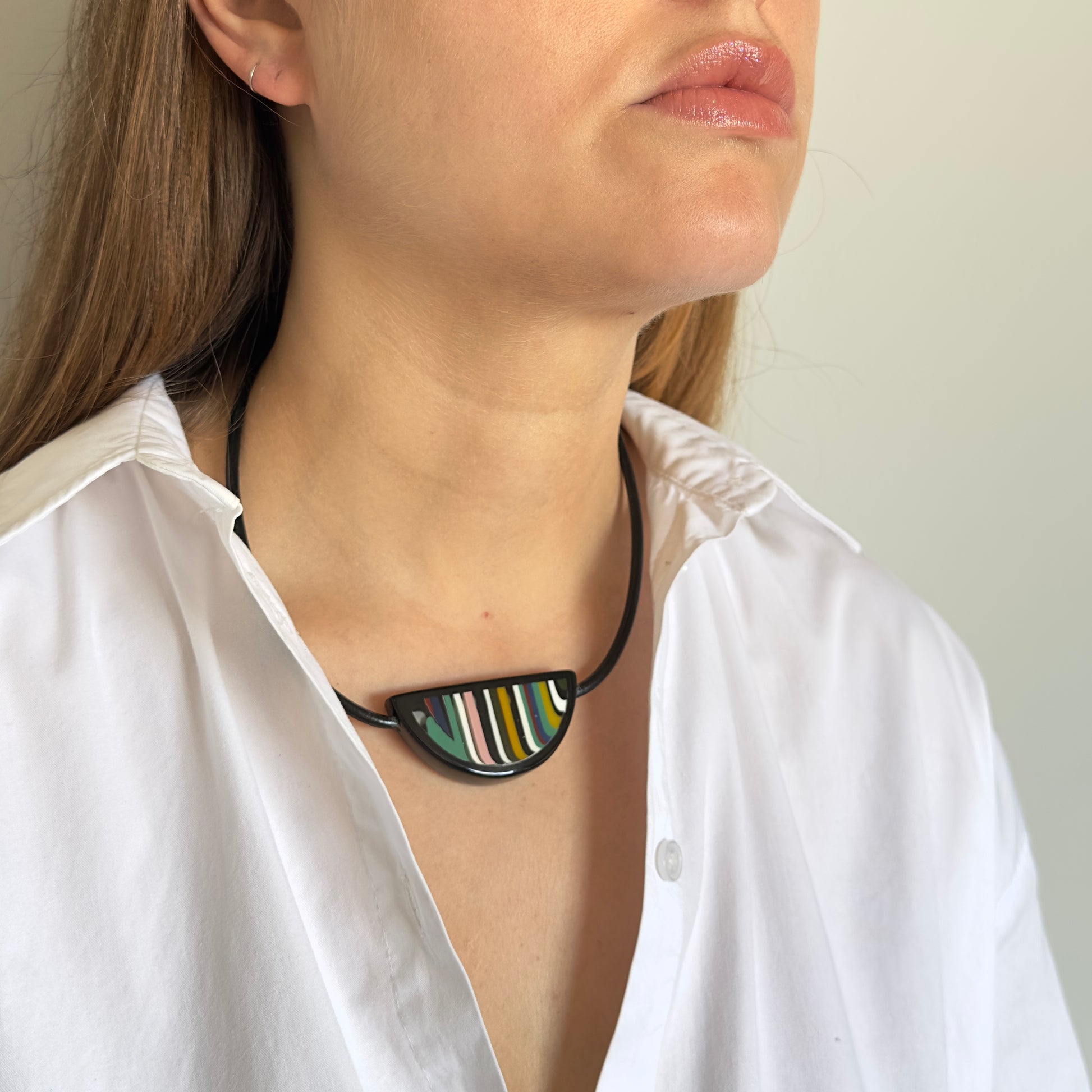 Colar meia-lua em resina com listras coloridas. Reversível: de um lado, multicolorido; do outro, preto minimalista. Dois colares em um.