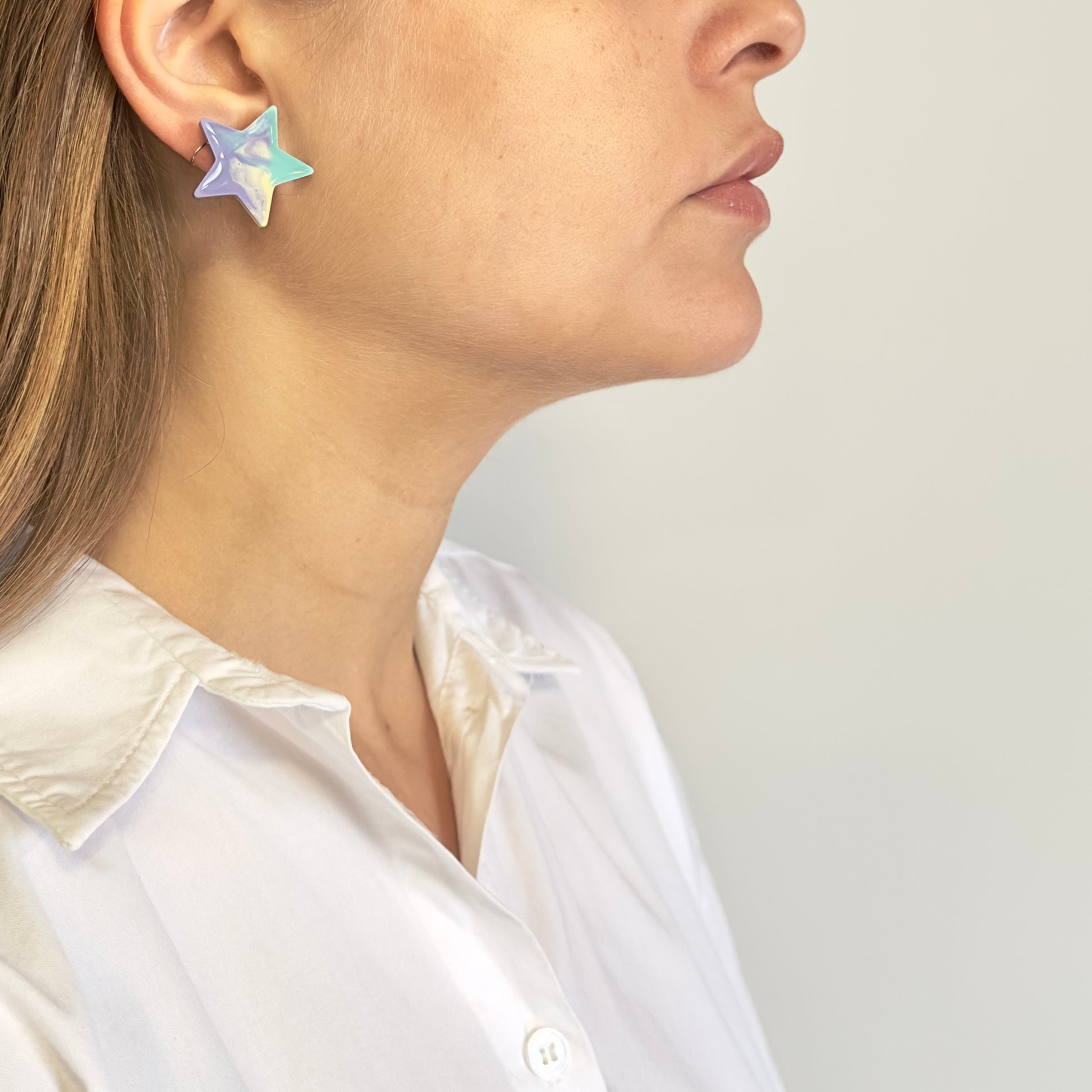 Delicado e divertido, o Brinco Estrela traz uma combinação de lilás, turquesa e marfim que ilumina qualquer produção.