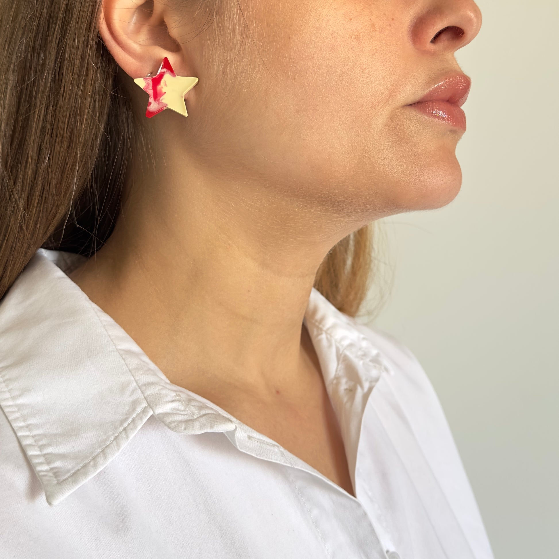 Brinco feito de resina, modelo em formato de estrela com combinação vibrante de marfim e vermelho. Um acessório divertido, leve e cheio de personalidade.