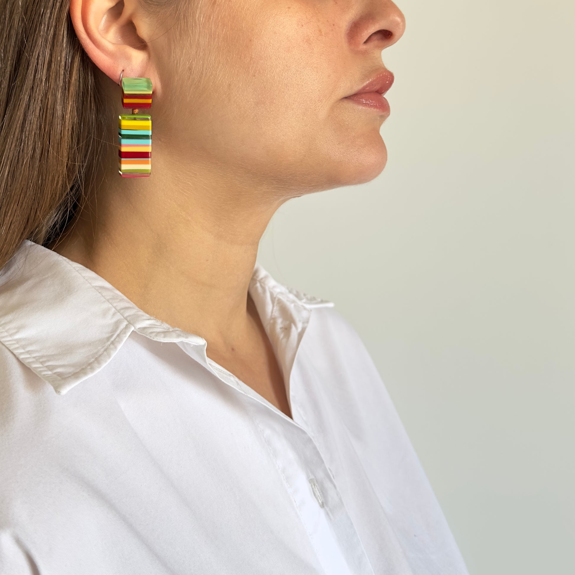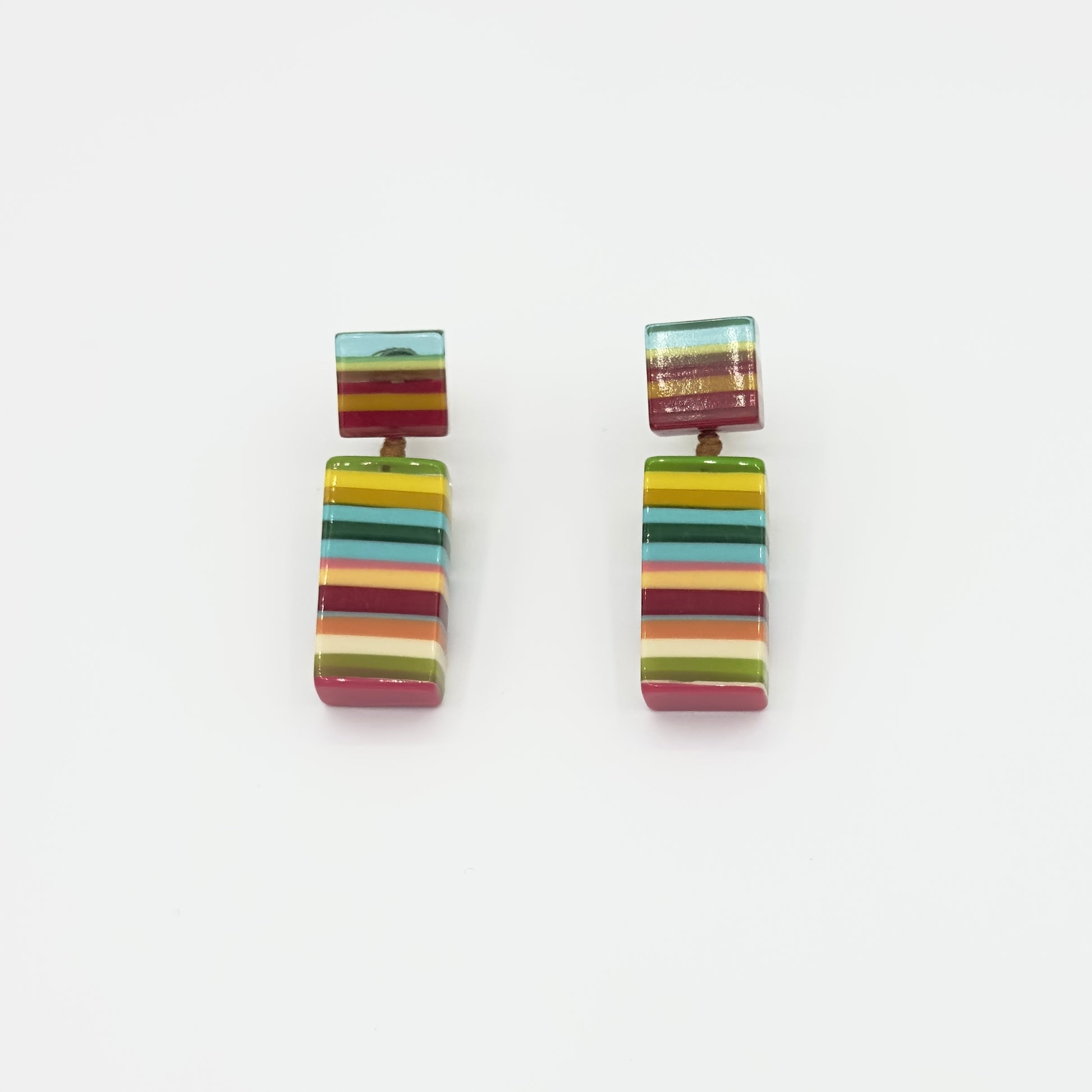 Brinco feito de resina, modelo reto com listras vibrantes. Moderno, leve e cheio de estilo.