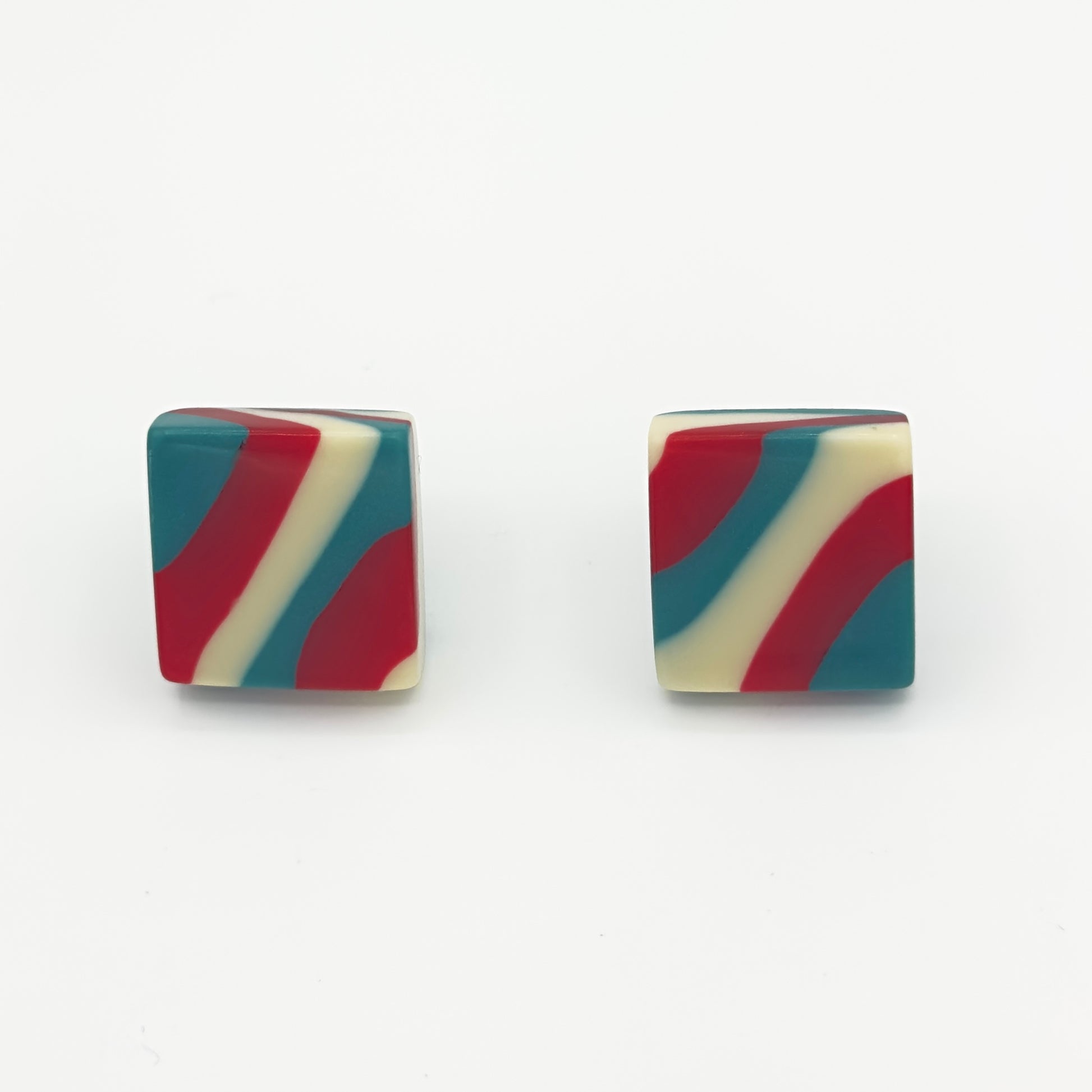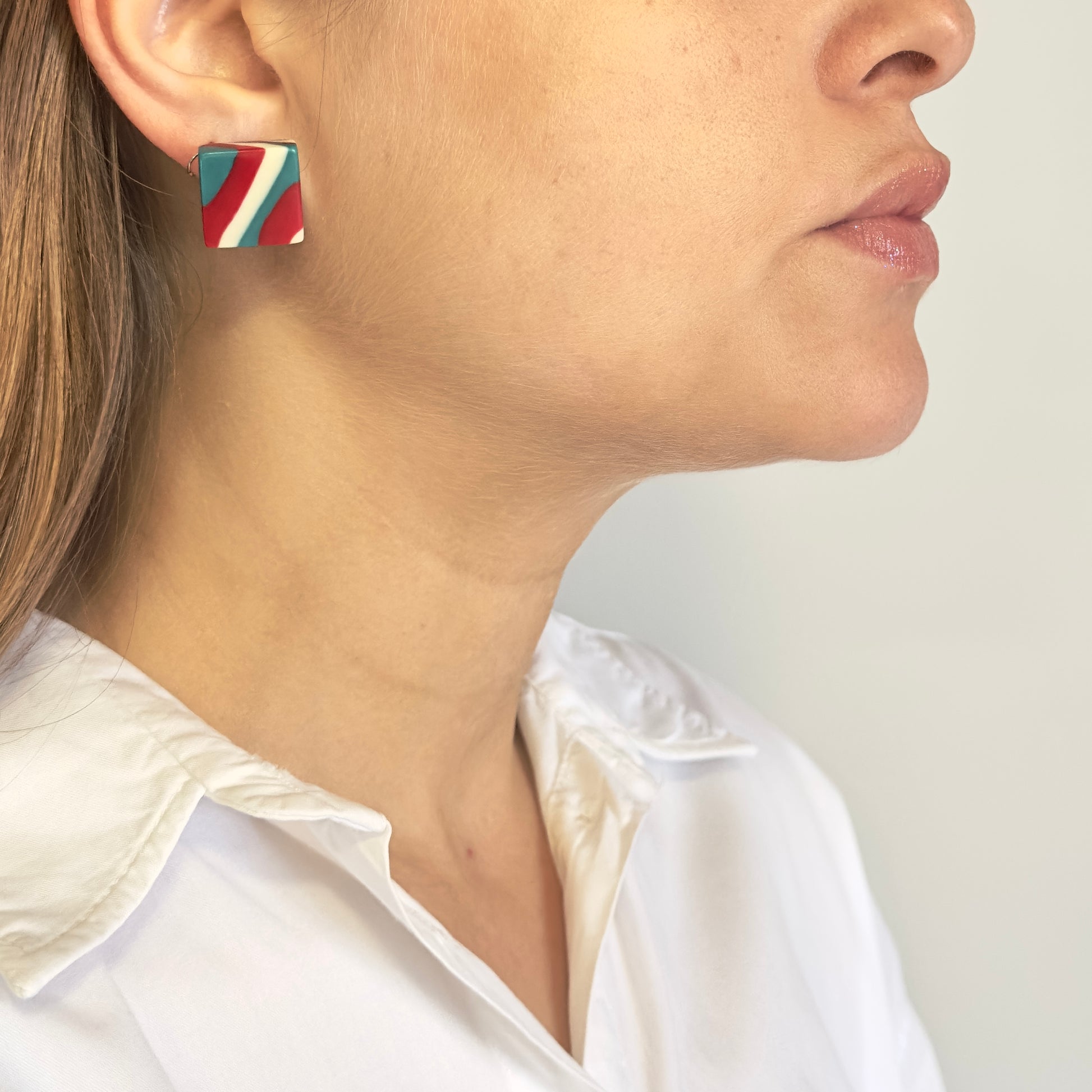 Color block em sua versão mais elegante. O Brinco Quadrado Pequeno mistura azul petróleo, vermelho vibrante e marfim para criar um acessório minimalista e marcante.
