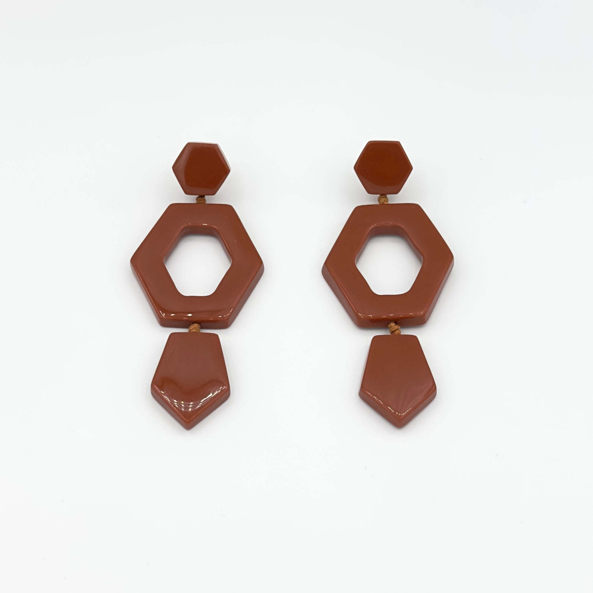 O Brinco Grande Geométrico explora linhas marcantes e a força da cor terracota para um visual expressivo.